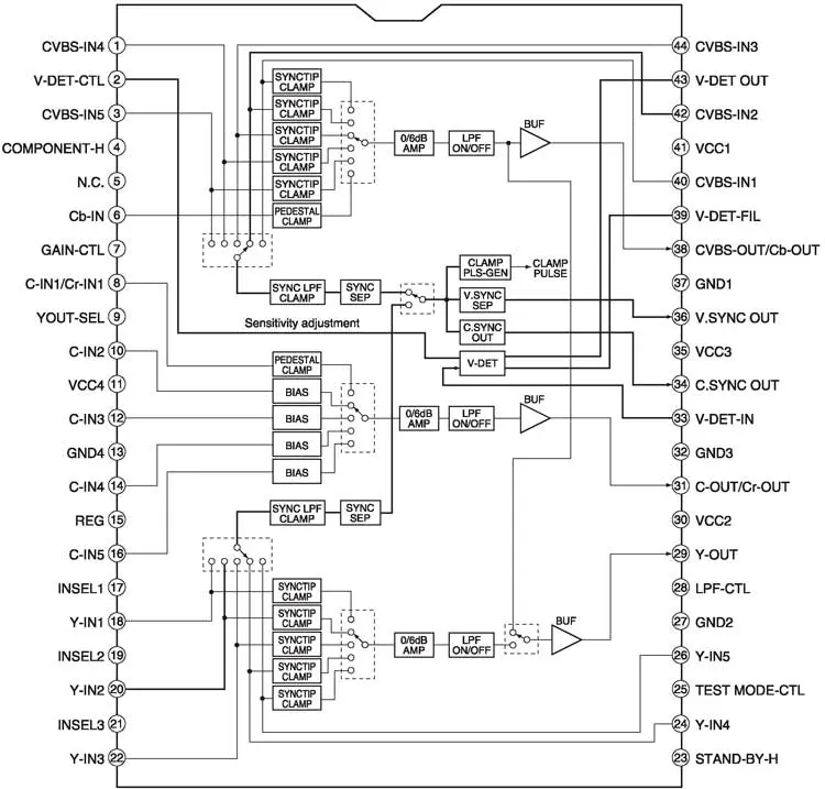 - IC401 (LA73031V-TBB), коммутатор видеосигналов для DVD-рекордеров фирмы Sanyo. Структура микросхемы приведена на рис. 6, в ее состав входят: фиксаторы уровня синхроимпульсов видеосигналов (SYNCTIP CLAMP, PEDESTAL CLAMP), синхронизируемые ФНЧ с фиксаторами уровня (SYNC LPF CLAMP), селекторы синхроимпульсов (SYNC SEP), видеоусилители (0/6 дБ AMP), ФНЧ (LPF), генератор импульсов фиксации уровня (CLAMP PLS-GEN), селектор кадровых синхроимпульсов (V. SYNC SEP), селектор вспышек (C. SYNC OUT), видеодетектор (V-DET), буферные каскады (BUF).