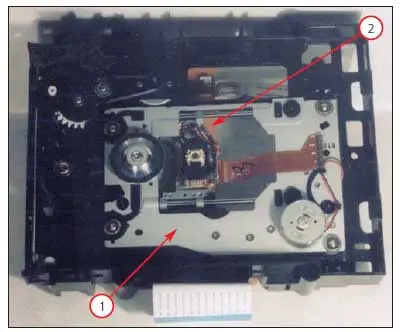После снятия кожуха, передней панели и верхней печатной платы (JACK РСВ) открывается доступ к приводу дисков. Если предполагается демонтаж оптического блока (Pick-up), необходимо перевести технологический переключатель, находящийся на плате привода под лотком, в левое положение. Процесс демонтажа привода дисков очевиден и комментариев не требует, на рис. 3 показан внешний вид привода дисков в сборе (в корпусе 2 с лотком 1). Лоток выдвигают, после чего снимают вручную, как было описано выше. Демонтаж механизма привода дисков 1 (рис. 4), закрепленного двумя защелками, производят после снятия платы привода 2 (ASSY-PCB DECK, расположена с обратной стороны корпуса).