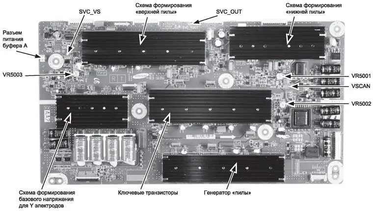Действие регулировочных резисторов VR5001-VR5003 на форму напряжений на электродах Y показано на рис. 3. Кратко работу платы Y можно описать следующим образом. Из напряжения Vs преобразователями Ys, Ye, основные узлы которых - гибридные ИМС (на рис. 7 скрыты под радиаторами), импульсный трансформатор и электролитические конденсаторы, формируются напряжения Ve, Vsc. Гибридным генератором Yr формируется пилообразное напряжение подсветки, преобразователи Yfr, Yrr совместно с силовыми ключами формируют импульсы переднего и заднего фронтов инициализации. Схема Yps формирует полный сигнал для электродов Y для всех подполей.