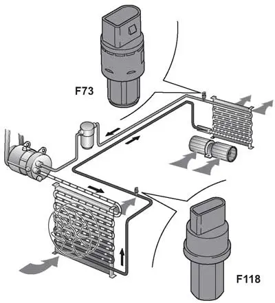 Выключатель по высокому давлению для климатической установки F118 отключает компрессор, например, при превышении номинального давления в контуре приблизительно на 3,0 МПа (30 бар). Абсолютные величины следует смотреть относительно конкретной климатической установки. Компрессор представляет для двигателя дополнительную нагрузку. Чтобы при очень большой нагрузке на двигатель, например, при движении в горах, не перегреть охлаждающую жидкость, дополнительная нагрузка от компрессора отключается.