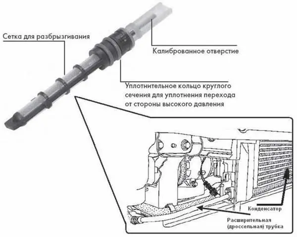 Дроссель представляет собой двухсоставную пластмассовую трубку, в которой имеются сетка-фильтр, сетка-разбрызгиватель и трубка с калиброванным отверстием. Как правило, расширительная дроссельная трубка устанавливается в непосредственной близости от конденсатора.