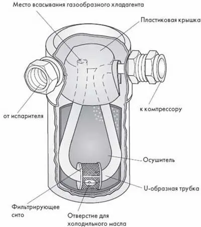Образование хладагента в газообразном состоянии происходит под пластиковой крышкой и через U-образную трубку исходит в компрессор в виде газа.