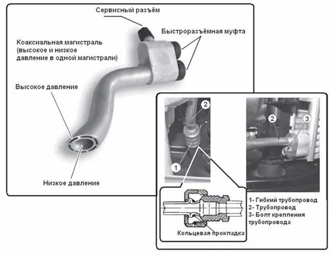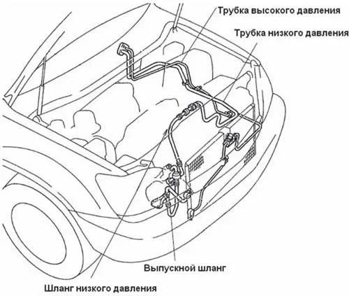 Система трубопроводов холодильного контура включает шланги (гибкие трубопроводы из армированного каучука) и трубки (жесткие трубопроводы из алюминия).