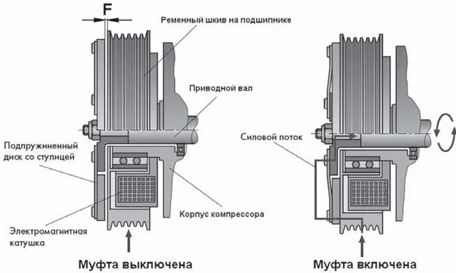 Во время включения электромагнитной катушки подпружиненный диск сдвигается к вращающемуся ременному шкиву (зазор F устранен). При этом возникает механическая связь, и вал компрессора начинает принудительно вращаться.