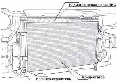 Конструктивно конденсатор выполнен из изогнутых трубок, изготовленных из алюминиевых сплавов, которые соединены перегородками. Внешне конденсатор напоминает радиатор охлаждения двигателя автомобиля. Он размещается в двигательном отсеке (см. рис. 6.) совместно с радиатором охлаждения ДВС и вентилятором системы охлаждения двигателя.