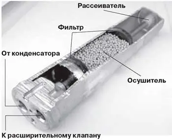 Далее после конденсатора охлажденный хладагент поступает в ресивер-осушитель, предназначенный для демпфирования колебаний потока хладагента. Данное устройство также осушает влагу, которая попадает в контур конструкции кондиционера.