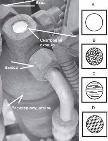 Системы кондиционирования, заправленные хладагентом R12, на ресиверах-осушителях имеется смотровое окошко, через которое можно контролировать работу системы при включенном компрессоре (см. рис. 8.).