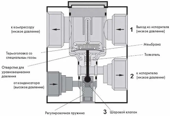 В свою очередь расширительный клапан постоянно реагирует на любое изменение давления, контролируя поток и испарение хладагента в испарителе.