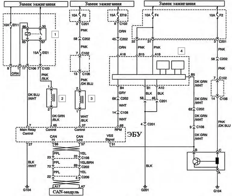Рис. 9. Схемы подключения контроллера к различным узлам ЭСУД, где: 1 - главное реле, 2 - клапан топливного насоса, 3 - клапан кондиционера, 4 - приборная панель, 5 - датчик скорости