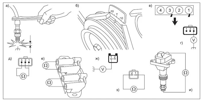 зажигания (см. рис. 10з) - оно должно быть равно 0,5±0,05 Ом;