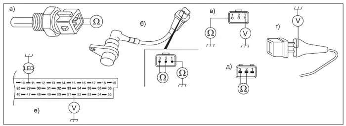 - подключают разъем к датчику IAT, запускают двигатель и проверяют изменение напряжения на контактах по мере нагрева двигателя (см. табл. 4 и рис. 9д). При несоответствии данных, приведенных в таблице, датчик заменяют.