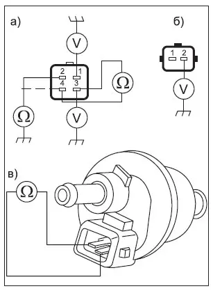- отключают разъем клапана EVAP и проверяют сопротивление его обмотки (см. рис. 12в), его величина должна быть около 26 Ом;