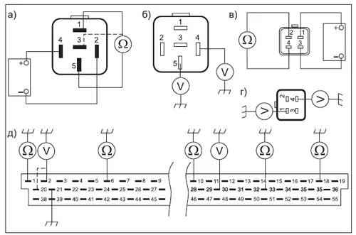 - извлекают реле К20 топливного насоса из разъема, собирают диагностическую схему (см. рис. 13в) и проверяют его срабатывание (контакты 2 и 4 должны замкнуться при подаче питания на контакты 1 и 3);