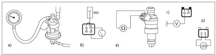 - подключают между контактами "1 и 2" разъема форсунки LED-ин-дикатор (операцию проводить для каждой форсунки) см. рис. 8д. Затем коротко прокручивают двигатель стартером - индикатор должен вспыхивать. Если этого не происходит, проверяют предохранители F, F5, реле K46, соответствующие соединения и, при необходимости, - ЕСМ;