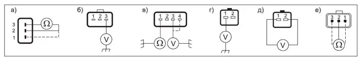 - включают зажигание и проверяют наличие напряжения 12 В на контактах 1 разъемов жгута (см. рис. 10ж). Если питания нет - проверяют замок зажигания и монтажные соединения;