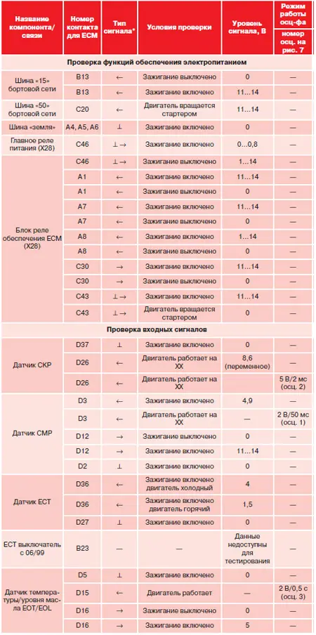 В табл. 1 приведены данные для проверки блока ECM "Bosch EDC 15C0". Они объединены в группы по функциональному назначению сигналов.