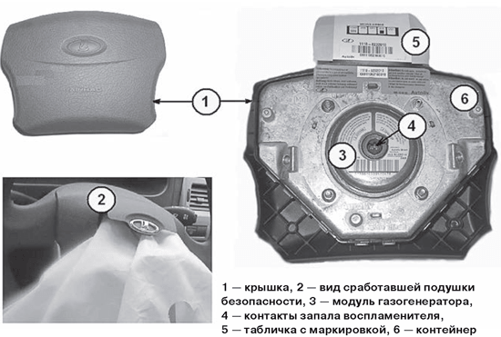 На рис. 2 показан общий вид компонентов надувной подушки безопасности на рулевом колесе автомобиля ВАЗ.