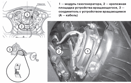 Соединитель с устройством вращающимся (3 на рис. 2) установлен на рулевом валу и представляет собой многожильный кабель, свернутый в спираль. Кабель служит для электрической связи соединительной колодки запала воспламенителя подушки безопасности со жгутом проводов автомобиля.
