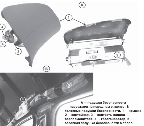 На рис. 4 показан внешний вид компонентов надувной подушки пассажира на переднем сиденье, а также внешний вид расположения головных подушек безопасности.