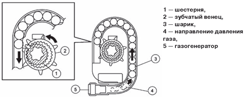 Рис. 6. Принцип работы шарикового преднатяжителя
