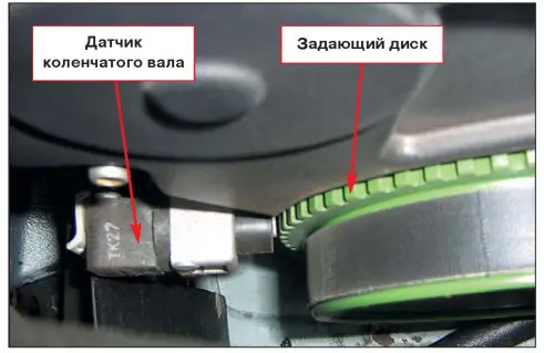 Датчик положения коленчатого вала (ДПКВ) - электромагнитного типа. Он располагается в непосредственной близости от задающего диска, закрепленного на коленчатом валу двигателя (рис. 5).