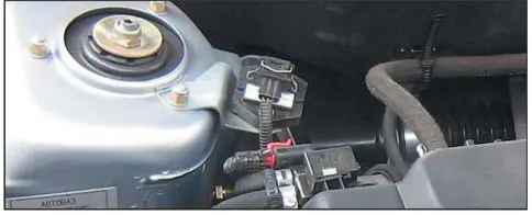 Работа датчика неровной дороги (ДНД) основана на пьезоэффекте. Датчик устанавливается на правой стойке кузова (по ходу движения) в моторном отсеке автомобиля. На рис. 7 показано расположение датчика на ВАЗ-11183 "Лада Калина", а на рис. 8 - на ВАЗ-2170 "Лада Приора".
