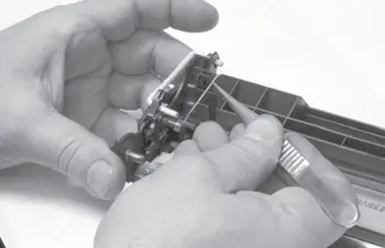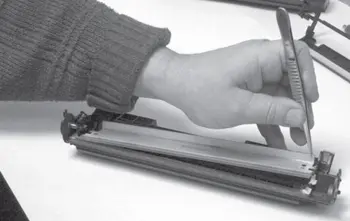 15. Наносят тальк или тонер (припудривают) на рабочую кромку чистящего лезвия для предотвращения ее заворота при вращении фотобарабана и повреждения светочувствительного слоя барабана.