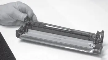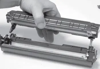 б) При снятии не допускают касания фотобарабаном корпуса картриджа для исключения повреждения светочувствительного слоя, нанесенного на фотобарабан.