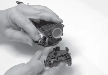 10. Располагают картридж фотобарабаном к себе, бункером отработки вниз (шестерня привода фотобарабана расположена справа) и, приподнимая верхнюю половинку картриджа вверх, разъединяют его корпус на две части (рис. 9).