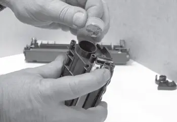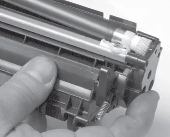 При снятии пружины нельзя допускать ее чрезмерного растяжения. В случае утери или деформации оригинальной пружины можно использовать пружину от картриджа C4092A (EP-22), установка которой осуществляется аналогично пружине, установленной на противоположной стороне картриджа. Место для ее установки на корпусе картриджа имеется.