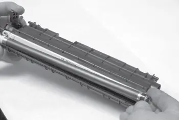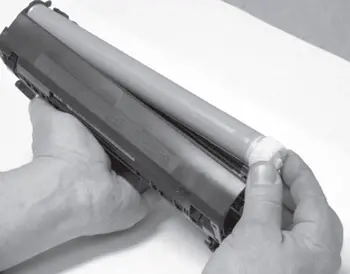 г) После снятия фотобарабан помещают в темное место на подложку, исключающую его повреждение.