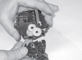 Перед очисткой второй половины картриджа следует обратить внимание на равномерность покрытия тонером оболочки магнитного вала. Для этого следует немного потрясти вторую половину картриджа с целью равномерного распределения в бункере остатков тонера, после чего проворачивают шестерню привода магнитного вала по направлению его вращения при работе на 2-3 оборота.
