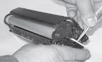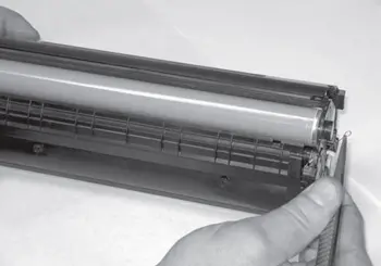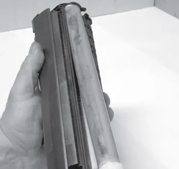 37.3. Осматривают поверхность фотобарабана. Обращают внимание на наличие механических повреждений и износа. При обнаружении дефектов и, учитывая качество распечатки, полученной перед выполнением заправки, фотобарабан меняют. При замене фотобарабана желательно заменить чистящее лезвие (ракель).