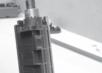 Доработка заключается в сверлении отверстия в корпусе заправочного бункера картриджа внутри горловины для пробки. После очистки второй половины картриджа (выполнение операции 19.8), используя дрель и кольцевую фрезу (корончатое сверло) диаметром 20,5 мм, просверливают отверстие в корпусе заправочного бункера картриджа внутри горловины для пробки (рис. 26). Перед выполнением данной операции отводят лопасть активатора на максимальное расстояние от проекции будущего отверстия, проворачивая шестерню привода активатора по направлению рабочего вращения. Сверление выполняют на малых оборотах.