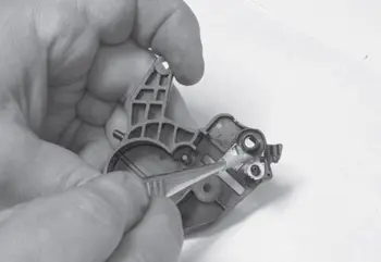 8. Через отверстия, находящиеся справа и слева от основания чистящего лезвия, выталкивателем нажимают на штифты, скрепляющие половинки картриджа, до их выхода из корпуса на величину, необходимую для захвата штифтов утконосами или бокорезами (рис. 7). При выталкивании штифтов необходимо соблюдать осторожность, чтобы не повредить посадочные отверстия штифтов в пластмассовом корпусе картриджа.
