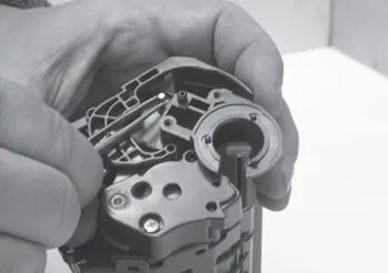 Запоминают расположение пружины в распорной втулке и очищают распорную втулку и контактную пружину (рис. 18). Наносят тонкий слой смазки на опорную поверхность сердечника магнитного вала и вставляют его в новую оболочку. На распорную втулку контактной группы устанавливают контактную пружину и наносят тонкий слой электропроводящей смазки на конец пружины, находящийся на распорной втулке. Устанавливают распорную втулку на место. При установке для предотвращения повреждения пружины желательно воспользоваться оправкой с внутренним диаметром 10 мм. При проведении указанных операций нельзя прикасаться к рабочей поверхности оболочки магнитного вала пальцами и инструментом. Допускается удерживать оболочку руками через безворсовую салфетку.