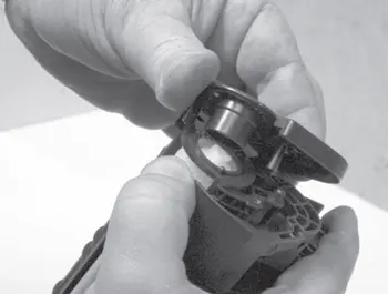 18. Безворсовой салфеткой протирают поверхность вала первичного заряда и осматривают ее. Если поверхность чистая и отсутствуют повреждения, то вал устанавливают на место. При обнаружении механических повреждений вал заряда необходимо заменить. Бушинги вала первичного заряда (левый и правый) отличаются. Бушинг черного цвета электропроводен и используется для подачи напряжения на вал первичного заряда, а белый бушинг - нет. При необходимости (отсутствие или пропадание электрического контакта между валом и бушингом при вращении) очищают посадочное место на шейке вала (сторона черного бушинга) и место посадки вала на бушинге черного цвета от старой смазки и затем наносят тонкий слой электропроводящей смазки.