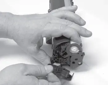 4. Придерживая фотобарабан за пластмассовую шестерню, колебательными движениями распределяют тонер, находящийся в бункере отработки по дальней стенке бункера.