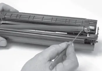 20. Очищают дозирующее лезвие и осматривают состояние рабочей кромки. При обнаружении повреждений, деформации, а также налипшего тонера (невозможность удаления, не повредив лезвие) на рабочей кромке, дозирующее лезвие подлежит замене.