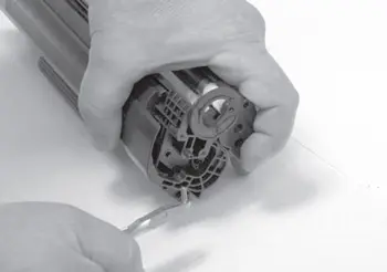 39. Вращают шестерню привода фотобарабана по направлению рабочего вращения, прокручивают фотобарабан на 2-3 оборота. При этом чистящее лезвие очищает барабан от присыпки. В процессе вращения барабана рывки и заедания недопустимы. Усилие, необходимое для прокрутки, должно быть постоянно.