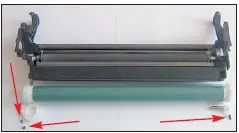 Вначале снимают фотобарабан - он извлекается достаточно просто, предварительно нужно открутить два самореза (на рис. 2 саморезы показаны стрелками). Затем снимают резиновый вал - это фактически коротрон заряда фотобарабана. Желательно еще снять втулку (белого цвета) резинового вала, иначе она будет мешать при снятии ракеля. Ракель