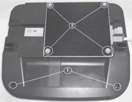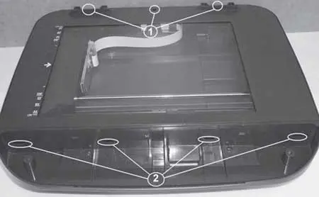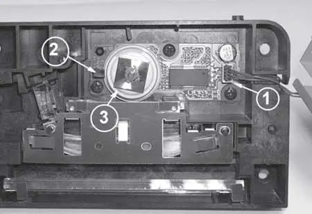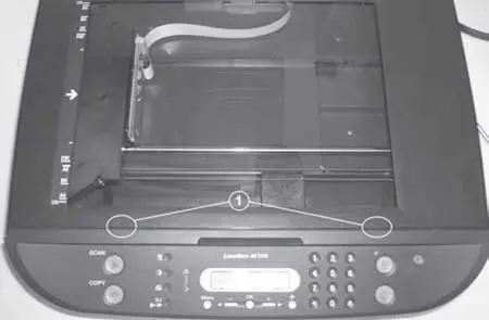 3. Располагают блок стеклом вверх, панелью управления к себе. Плоской отверткой отжимают две защелки, расположенные возле стрелок (рис. 32, поз. 1). Приподнимают панель управления, освобождают от оставшихся защелок и снимают ее с блока сканера. Для снятия платы с панели откручивают десять саморезов.