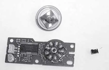 При необходимости (в случаях, если двигатель не набирает обороты, принтер не выходит на готовность или присутствует повышенный шум при работе) выполняют профилактику двигателя привода квадратного зеркала. Профилактика включает разборку двигателя, очистку вала и латунной втулки, нанесение смазки и сборку. Для снятия ротора двигателя поворачивают на 90 градусов Г-образный держатель (рис.17, поз. 2), расположенный на плате управления дви-гателем (сторона, противоположная микросхеме) и, перемещая вверх, снимают его. Приподнимают ротор вверх и снимают его с электродвигателя (рис. 17, поз. 3). Тщательно очищают ось ротора и латунную втулку (расположена на статоре) от загрязнений и старой смазки с помощью спирта и безворсовой салфетки. Наносят небольшое количество жидкой смазки, устанавливают ротор и Г-образный фиксатор на место. При нанесении большого количества масла двигатель не сможет набрать необходимые обороты и принтер не выйдет на готовность. Для удобства выполнения операции снимают электродвигатель вместе с платой управления с корпуса блока (рис. 18). Для снятия откручивают три самореза крепления платы к корпусу блока лазера. При выполнении операций не допускают прикосновения к граням зеркала и оптическим поверхностям элементов блока пальцами рук и инструментом.