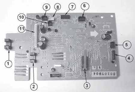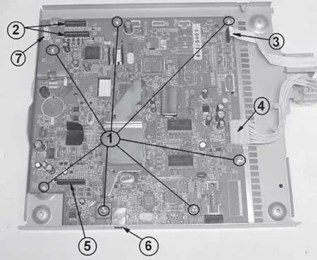4. Для демонтажа платы с основания отключают шлейф подключения к принтеру и разъем питания. Откручивают семь винтов и снимают плату с основания (рис. 31, поз. 1). Положение разъемов на плате указано на рис. 31, где: