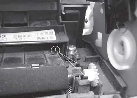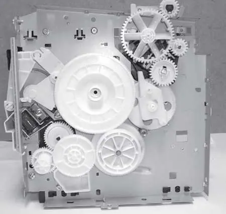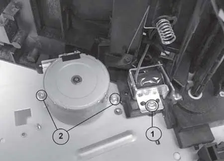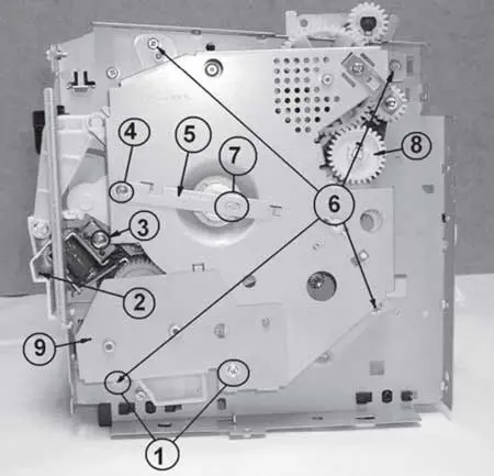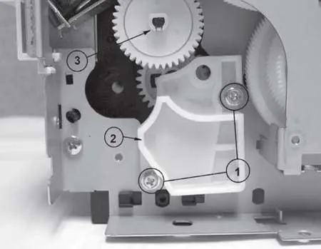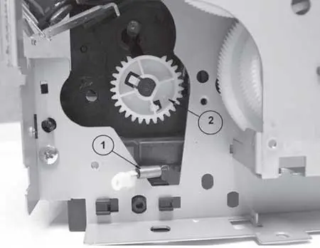 1. Располагают принтер правой стороной к себе. Откручивают два винта (рис. 20, поз. 1), снимают крышку (рис. 20, поз. 9), закрывающую шестерни и муфту, и затем снимают две шестерни. Откручивают два винта (рис. 21, поз. 1) и снимают пластмассовую пластину (рис. 21, поз. 2), отверстие в которой служит подшипником скольжения для оси шестерни, передающей вращение от редуктора на муфту. Отжимают защелку фиксации муфты на оси и снимают ее (рис. 21, поз. 3). Снимают пружину с шестерни привода ролика захвата бумаги (рис. 22, поз. 1). Отжимают фиксатор и снимают шестерню (рис. 22, поз. 2) с оси ролика.