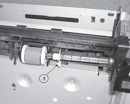 2. Располагают устройство лицевой стороной к себе и, наклонив от себя, выводят фиксатор ролика захвата бумаги из углубления в станине, поворачивают к себе до совмещения выступа с пазом на корпусе и перемещают вправо по оси до выхода из посадочного отверстия (рис. 23, поз. 1). Перемещают ролик подачи вправо и снимают его.