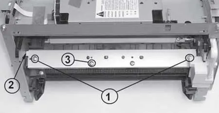 2. Откручивают два самореза крепления планки держателя роликов прижима (рис. 25, поз. 1), винт под платой датчиков (рис. 25, поз. 2) и саморез крепления опоры левого ролика к держателю (рис. 25, поз. 3). Снимают держатель в сборе с правым прижимным роликом (рис. 26, поз. 1).