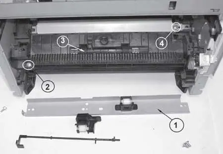 4. Откручивают саморез и снимают направляющую бумаги при захвате из нижнего лотка (рис. 26, поз. 2).