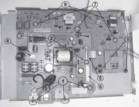 Плата ВП закреплена тремя винтами (рис. 29, поз. 7) и поддерживается тремя пластмассовыми стойками (рис. 29, поз. 8). Для снятия платы откручивают три винта.