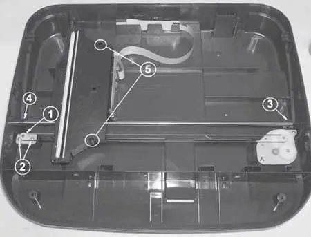 5. Располагают каретку лампой сканера вверх. Откручивают два самореза (рис. 34, поз. 5) и снимают крышку каретки. Для снятия крышку слегка сдвигают вправо до выхода ее направляющих из прямоугольных пазов корпуса каретки с левой стороны.